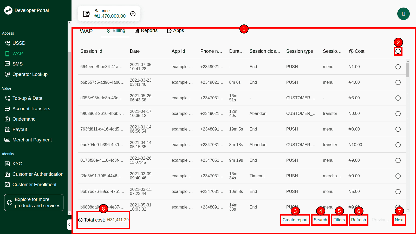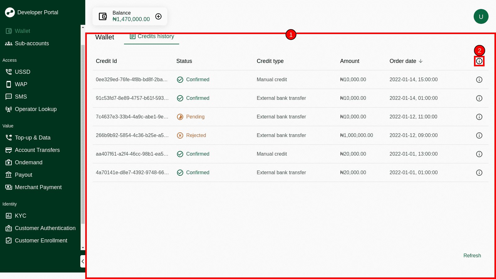 | 1 | User account manager | Allows to update account information, low balance notification, regenerate client ID and secret, get acces to User Guide and information about Developer Portal, add funds to Wallet and log out from Developer Portal |