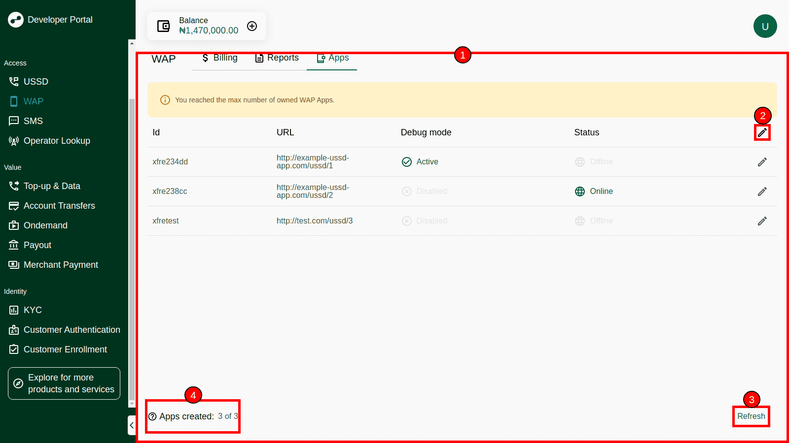 | 4 | Create new app button | Allows to create a new USSD app, disabled when you reached limit of apps |